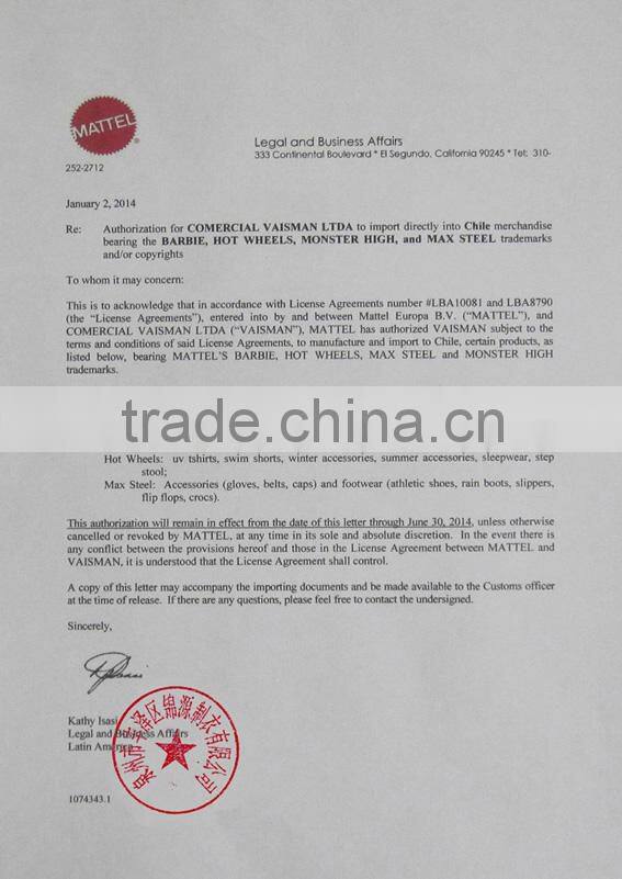 We are supplier for Disney/Carte/Mattel/Hello Kitty and many famous brands from 2008 which has won us good reputation from our clients. We got most famous brand licence and rich producing experience such as :Disney,Care Bear,Tom&Jerry,Monster High,Angel Cat,Angry Bird,Hello Kitty,Barbie etc.Full series of garment products help customers a great deal in selecting and placing order with high quality,superb designs,competitive price &the best serive .